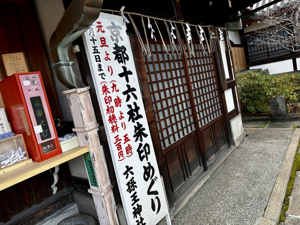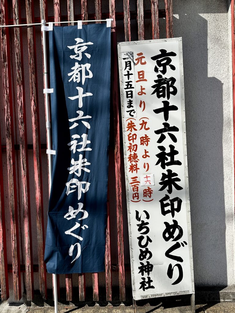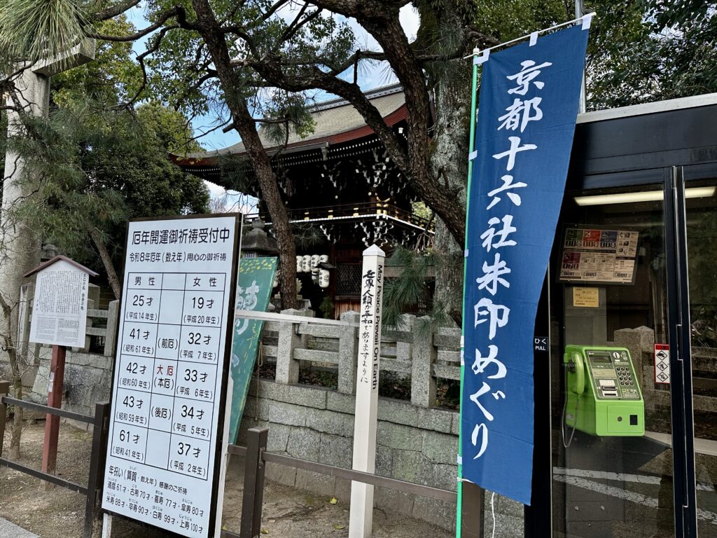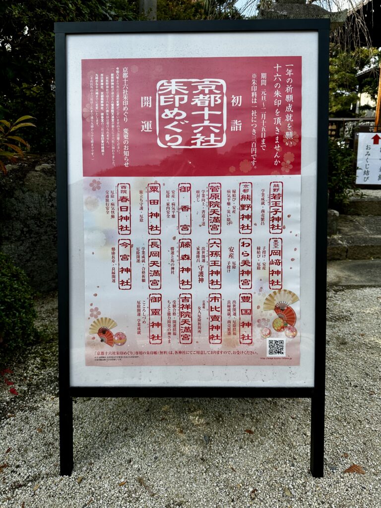 今年の「京都十六社朱印めぐり」の看板だよ。だいたい、入口においてあるので、ここだ〜ってわかりやすいと思うよ