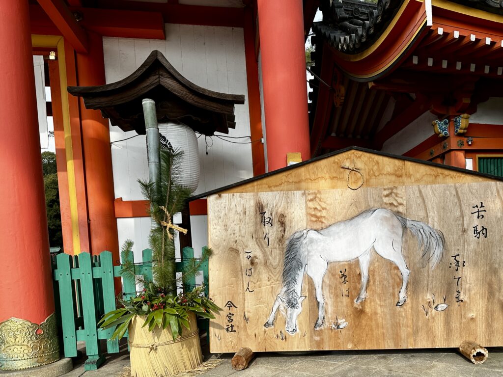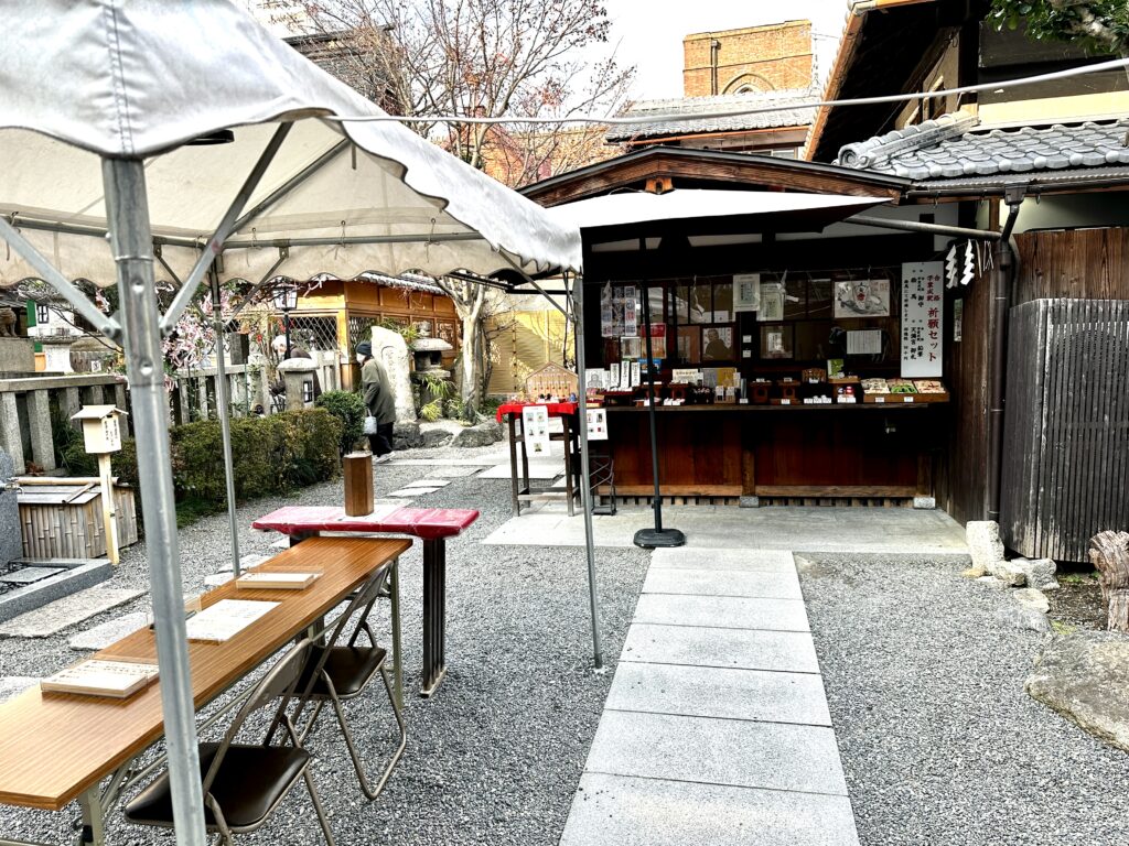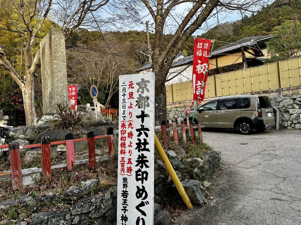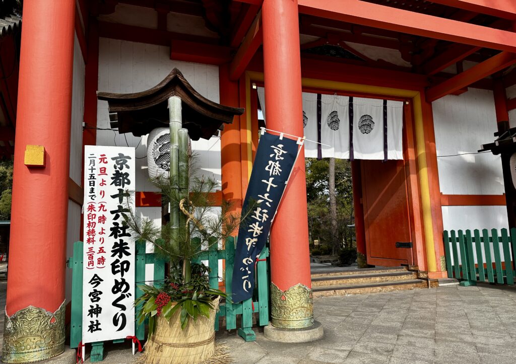 今年の「京都十六社朱印めぐり」の看板だよ。だいたい、入口においてあるので、ここだ〜ってわかりやすいと思うよ