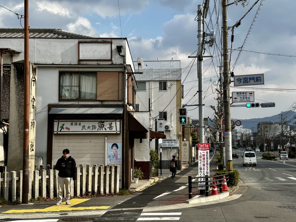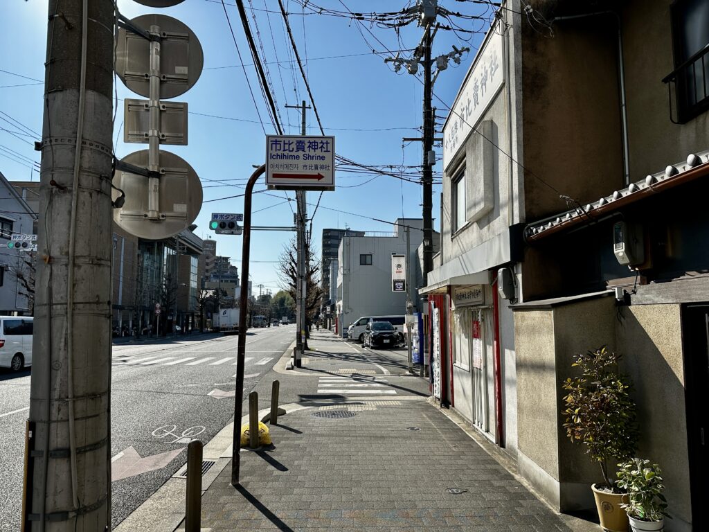 外に出たら(角は「ハマムラ」という中華屋さんです)右に曲がり、八条通りをただひたすら歩きます。途中道が細くなり、不安になりますが大丈夫です。しばらくいくと、鳥居が見えます