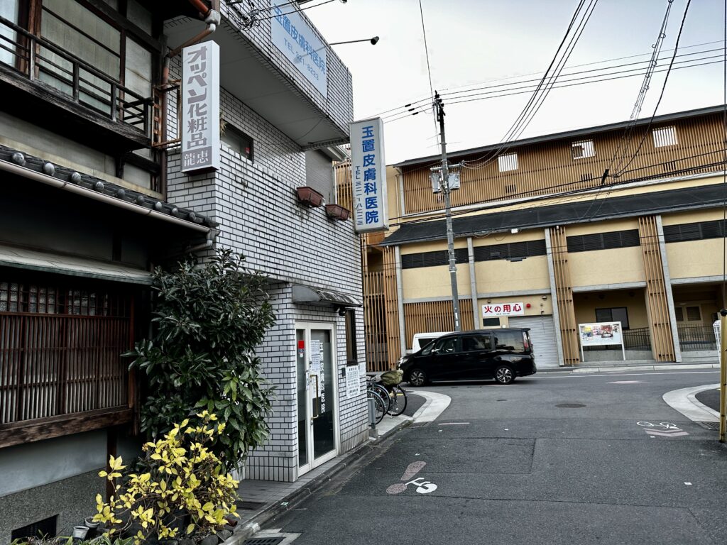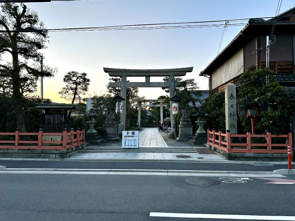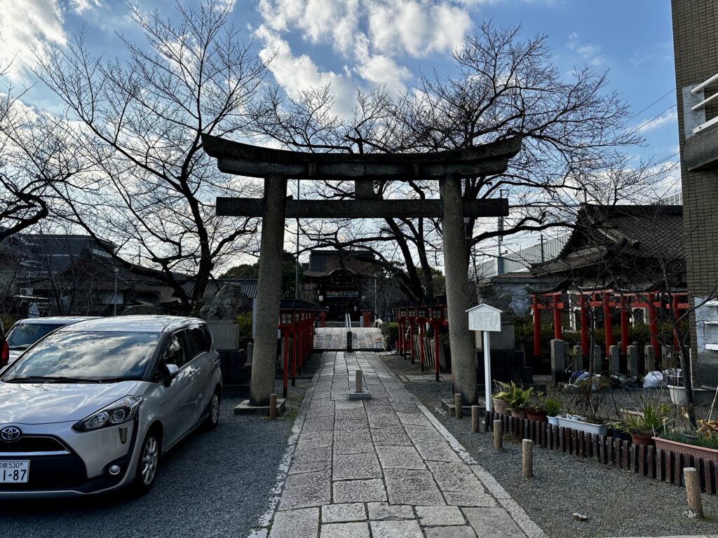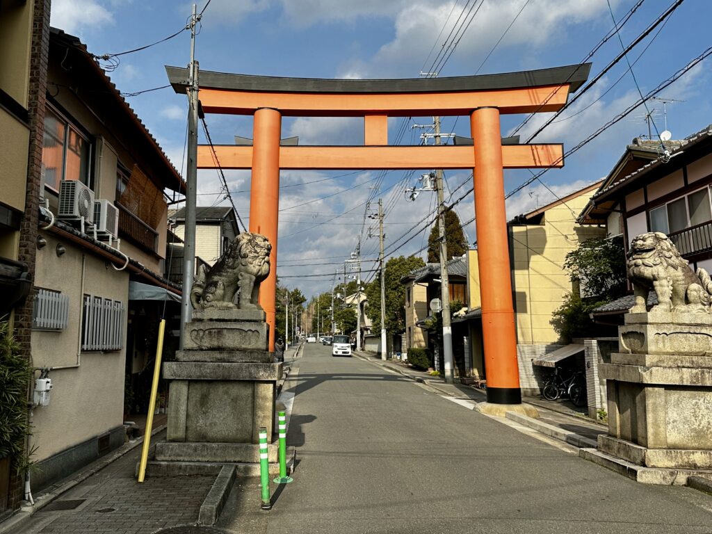 「西大路四条」バス停でおりたら、右にまがり、「ピザハット」の先を左に曲がります。しばらく歩き「玉置皮膚科医院」が見えたら、左に曲がると春日通り(佐井通り)に出ます。斜め前に鳥居が見えたら到着