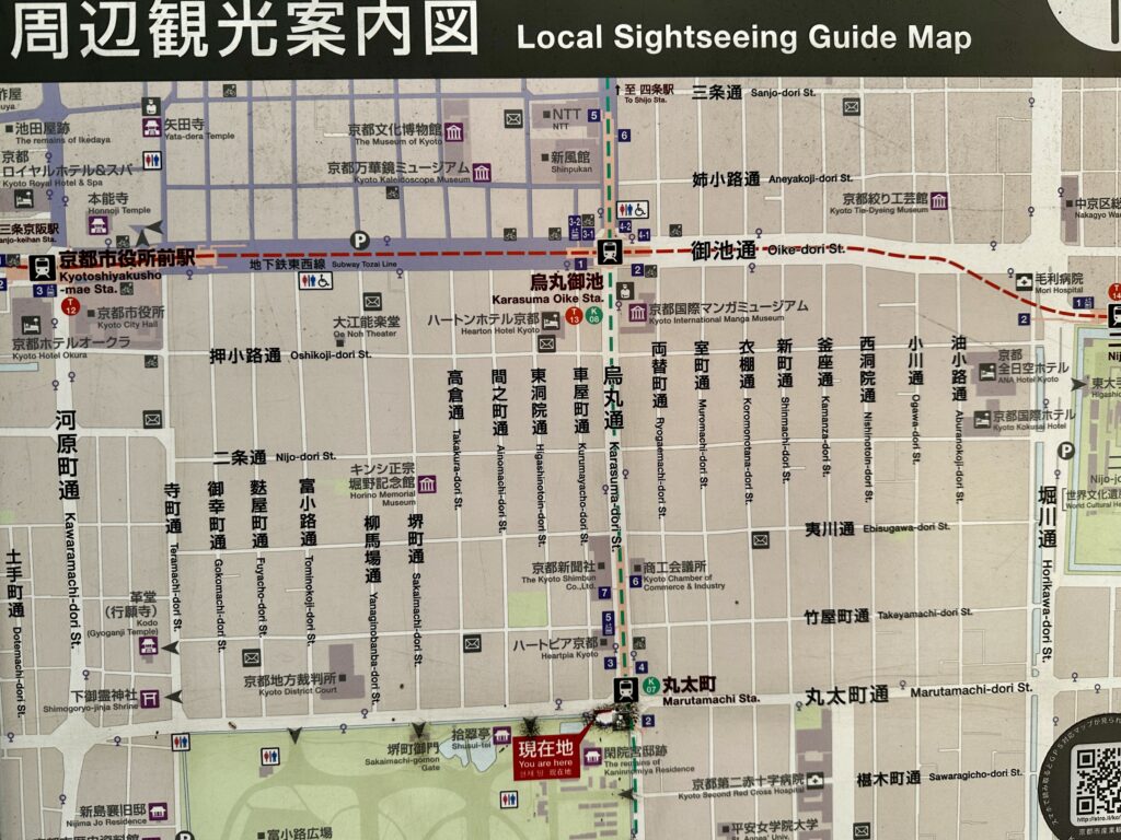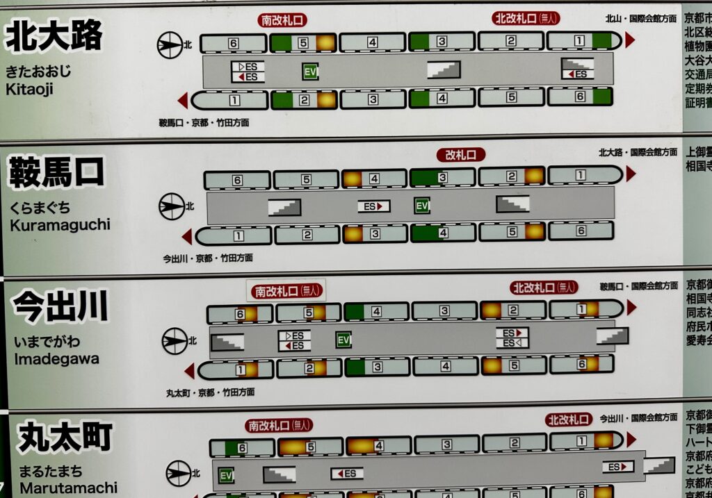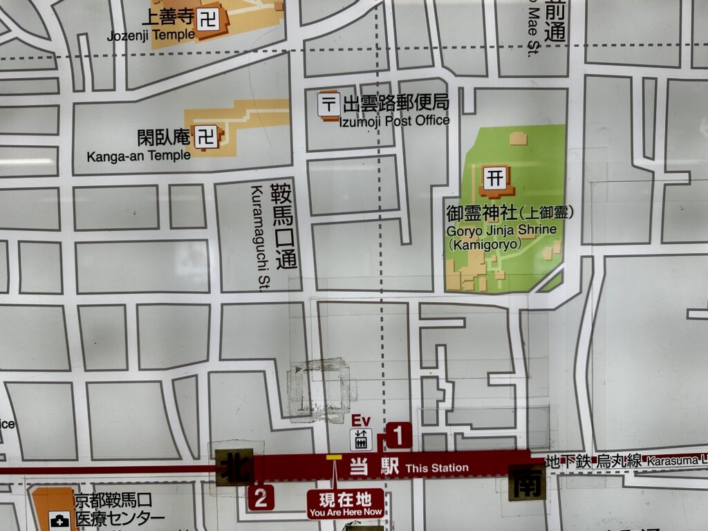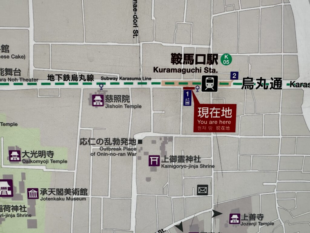 来た道を戻り阪急「長岡天神駅」まで歩き、(河原町行き)方面の電車に約13分乗り、阪急「烏丸駅」で下車します