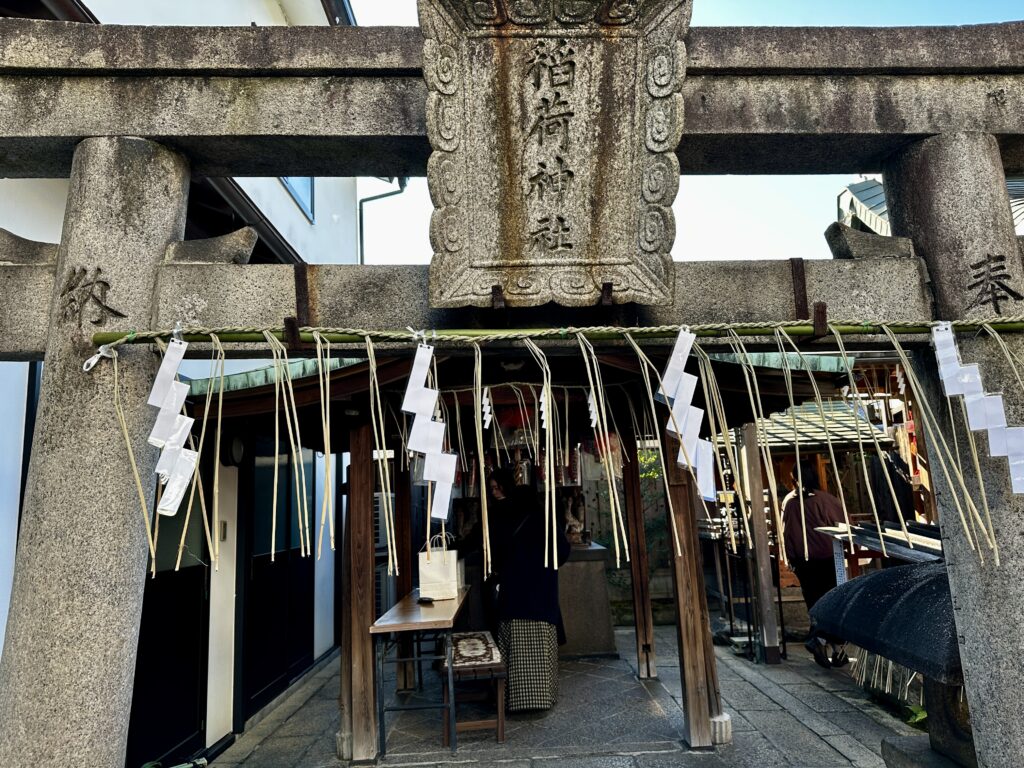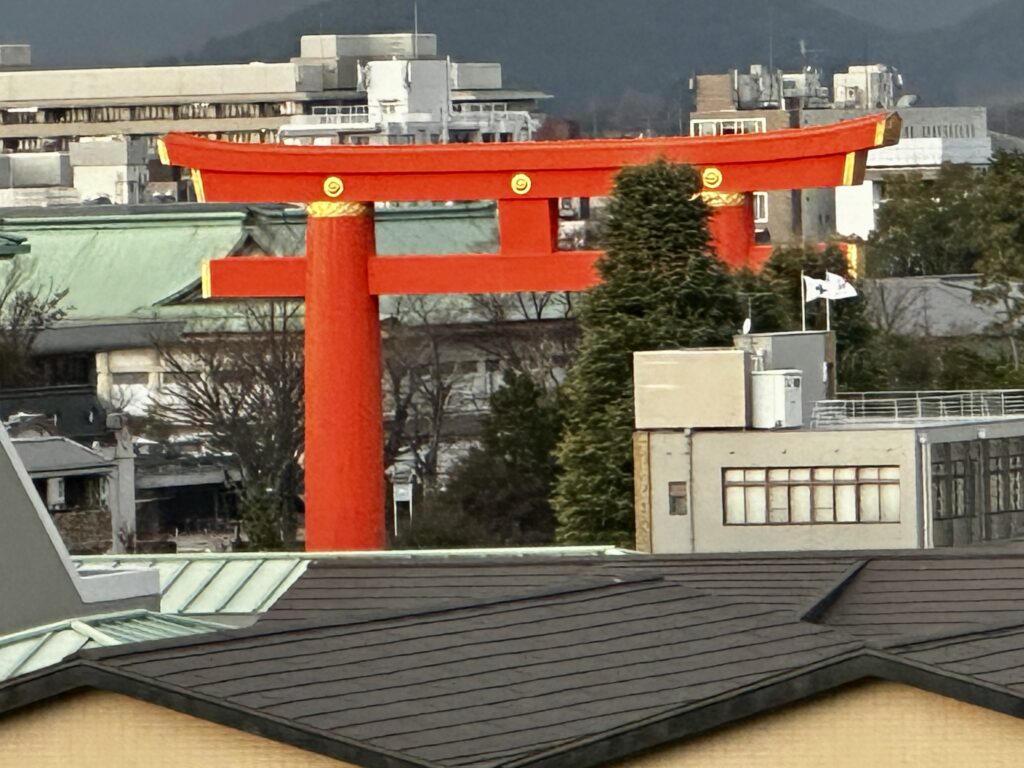 来た道を戻り、河原町通りに出たら、右に曲がります。ひたすら歩くと左手に「サン・マルタン」というホテルがあるので左に曲がります。高瀬川の正面橋と鴨川の正面橋をこえると、大きな鳥居がど〜んと見えます。
