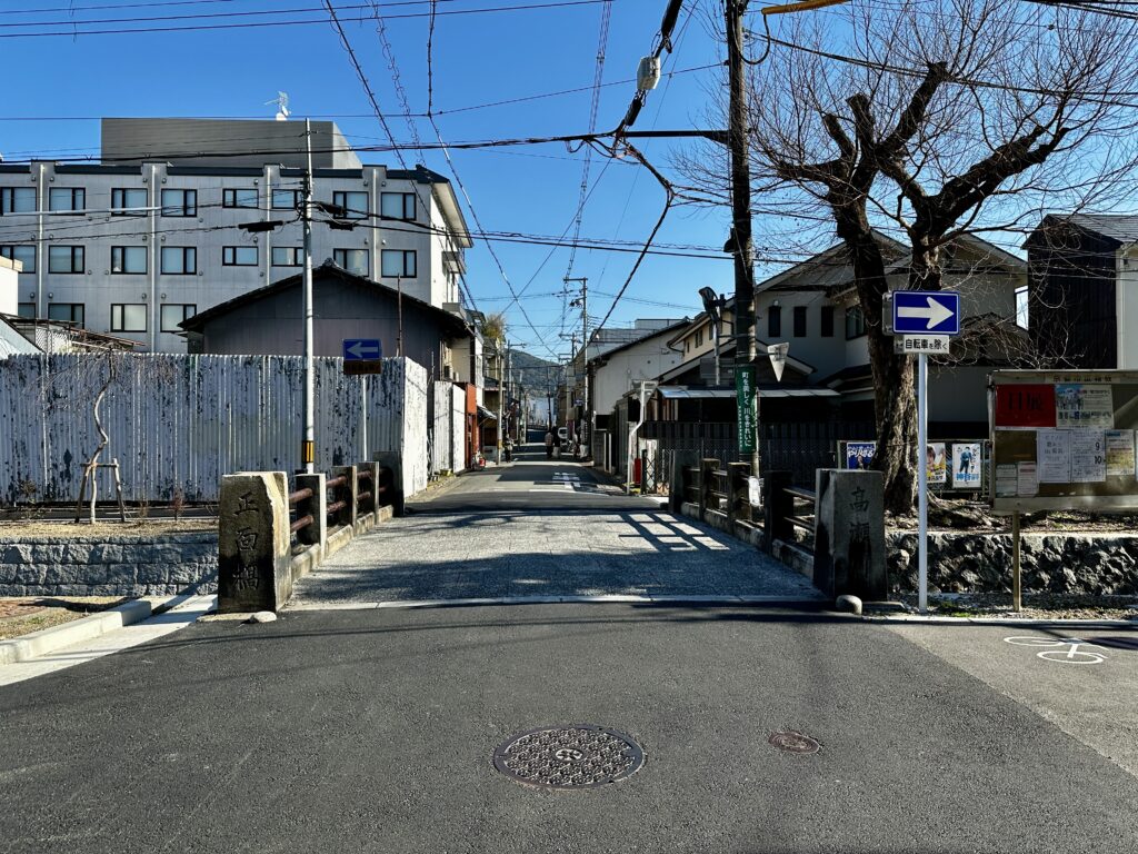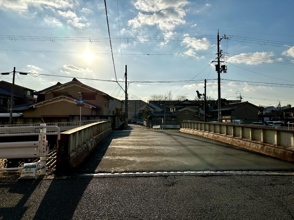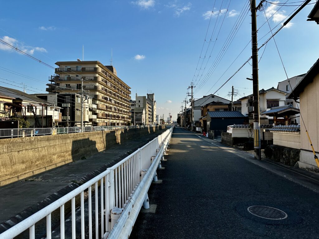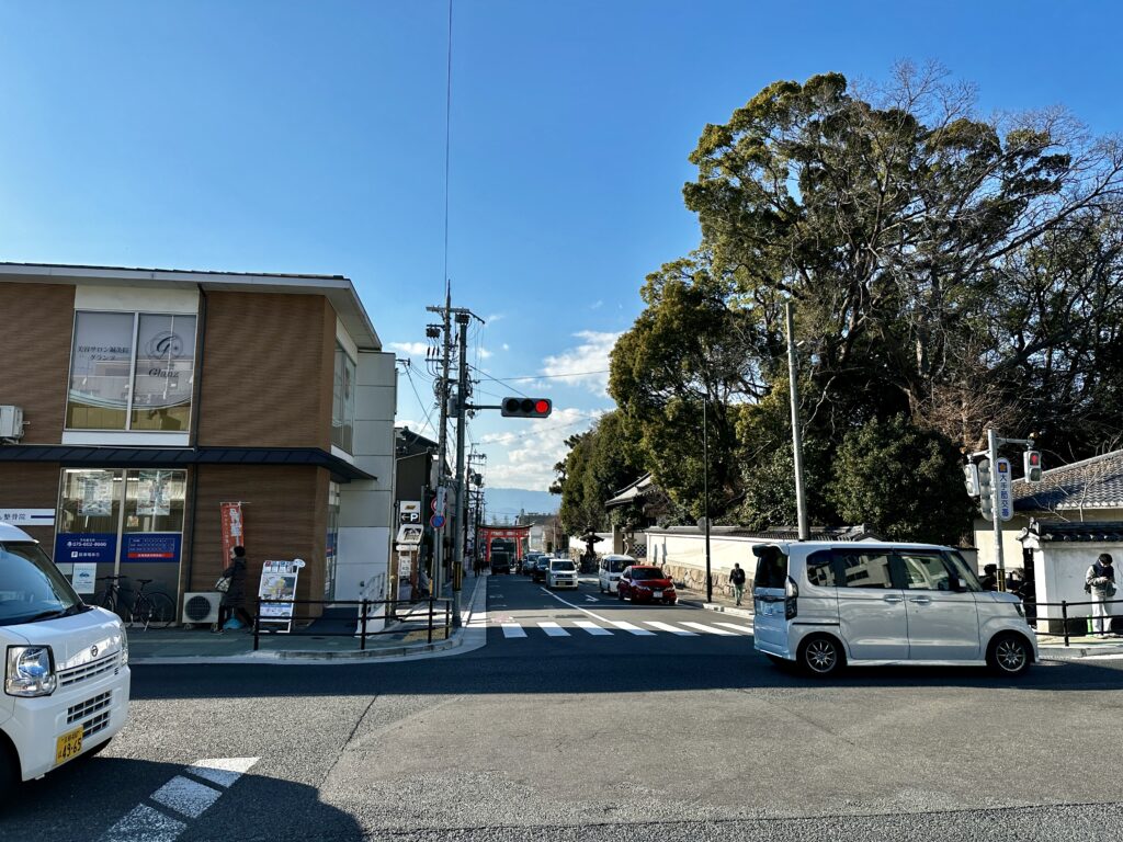 イオンの前の「西大路通り」を渡り、まっすぐ行って橋を渡って、すぐ左に曲がります。しばらく行くと右手に鳥居が見えます