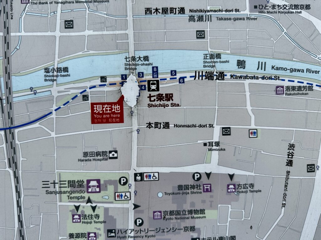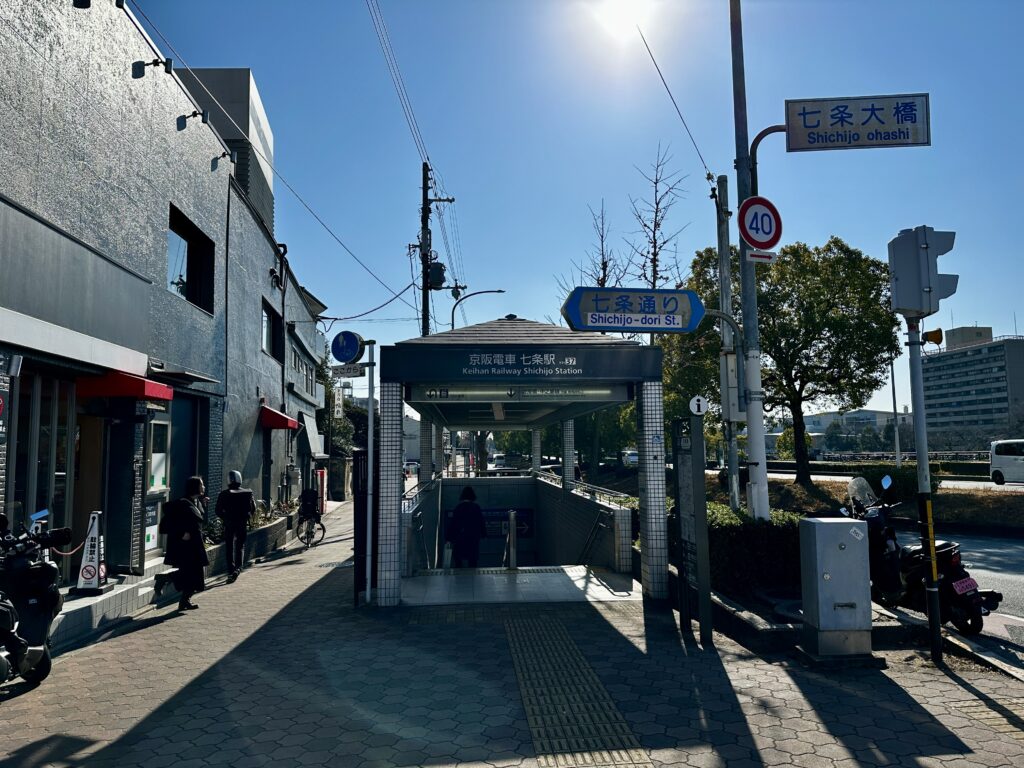豊国神社を出て、すぐに左に曲がって、七条通りにぶつかったら、右に曲がり、まっすぐいくと京阪の「七条駅」に着くよ