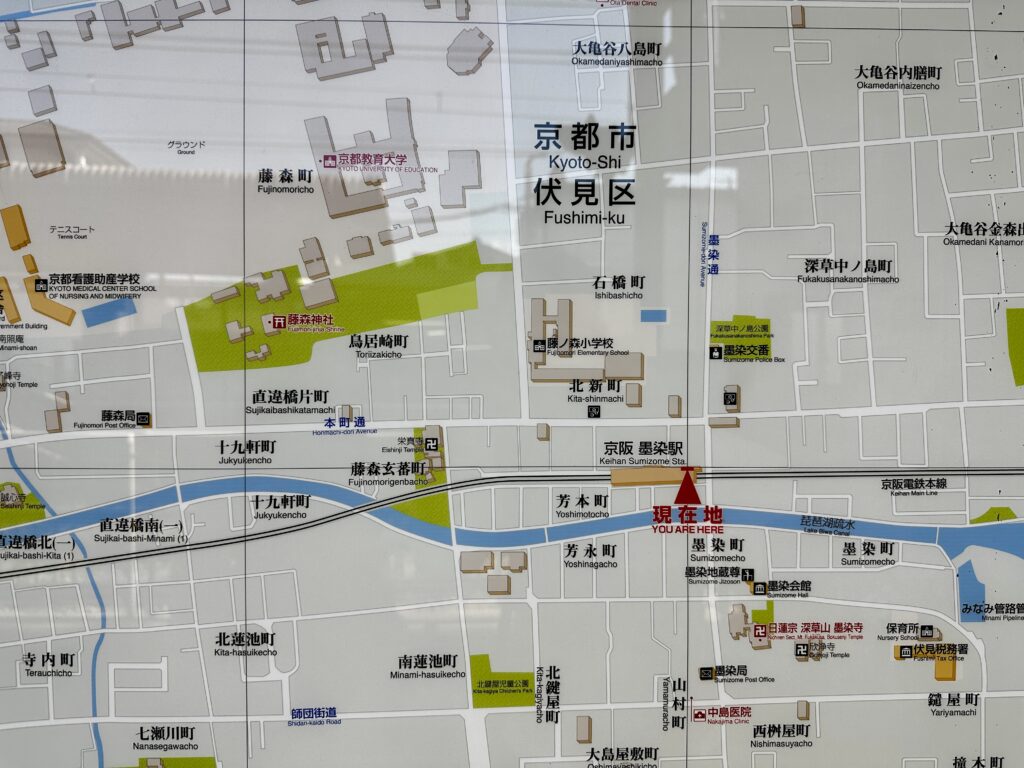 墨染駅を降りたら、左方向に歩き、すぐの交差点を左に曲がります。まっすぐ歩くと、次の交差点に「藤森神社→」の看板が見えますので。そこを右に曲がり、あとはひたすらまっすぐいくと大きな藤森神社の看板が見えます