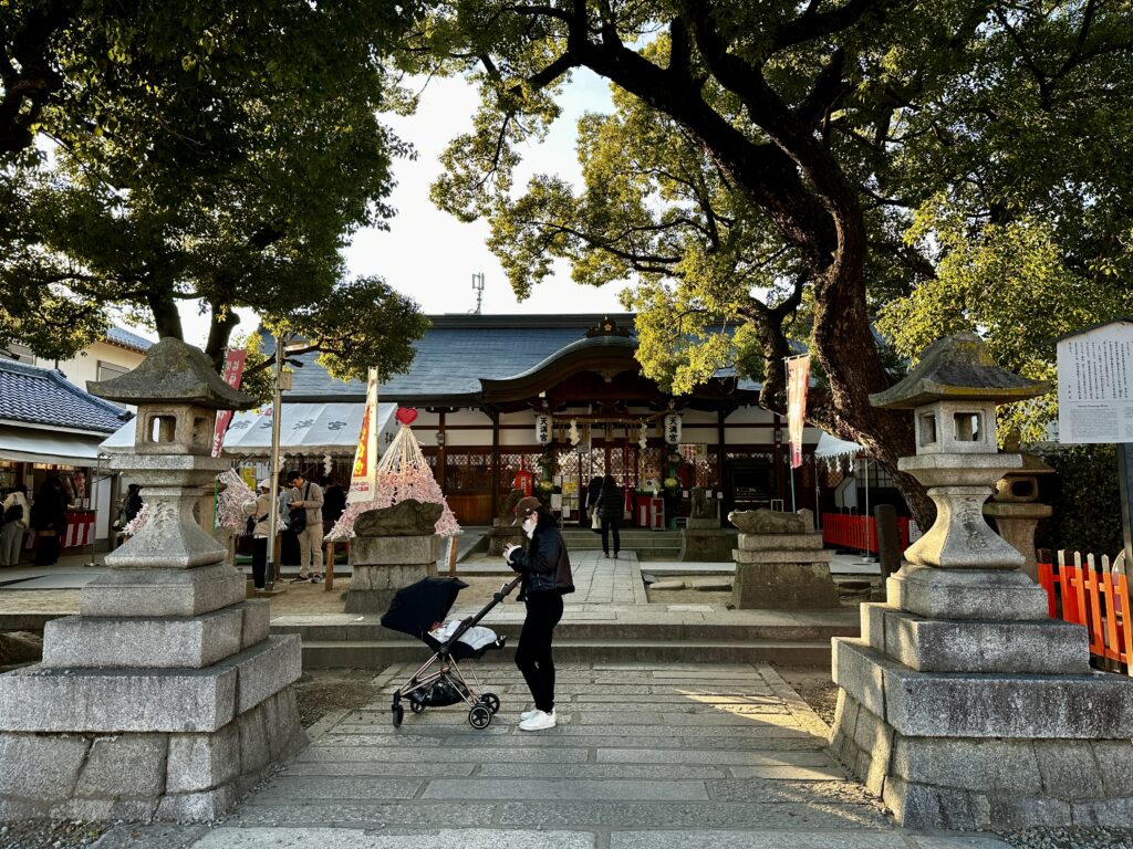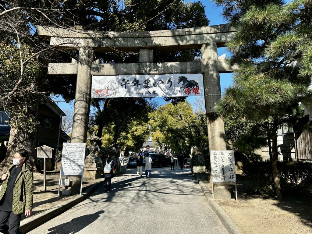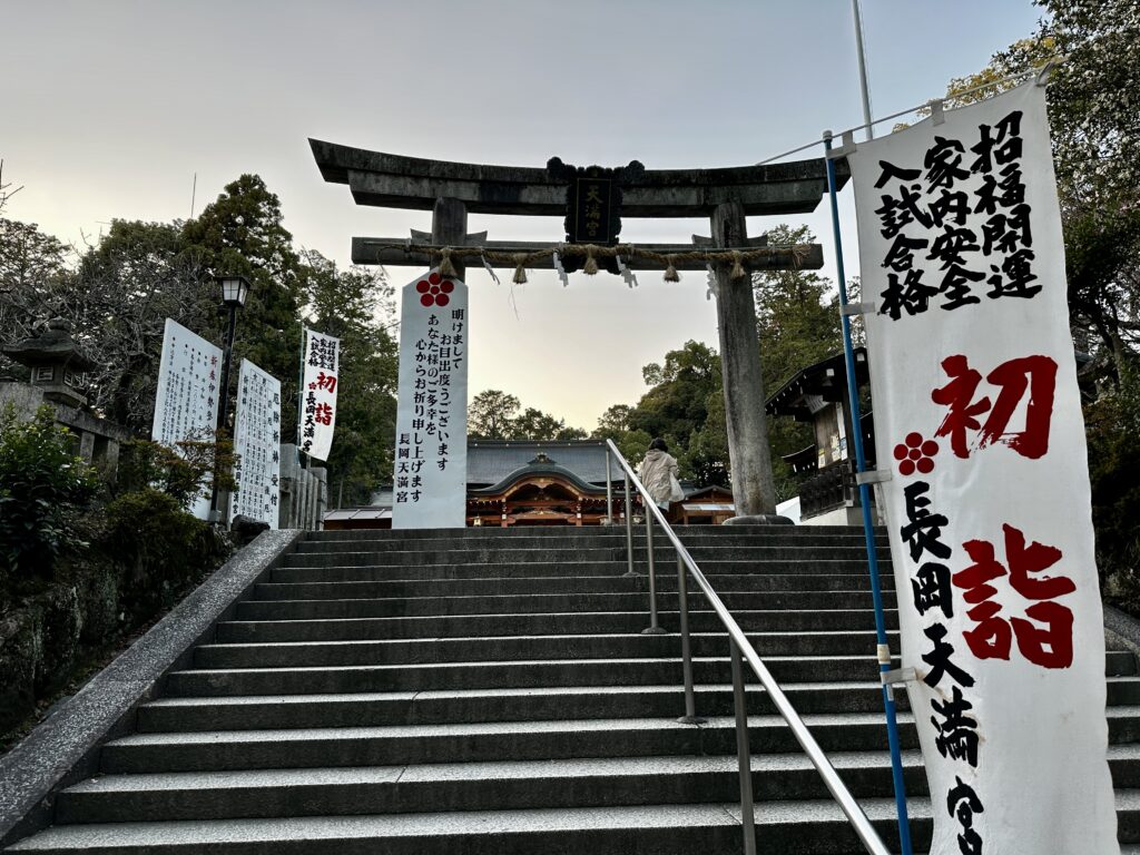 阪急「長岡天神」駅で降りたら、左に曲がり、踏切まで出たら、右に曲がりまっす歩いていくと、大きな鳥居が見えてきます。
