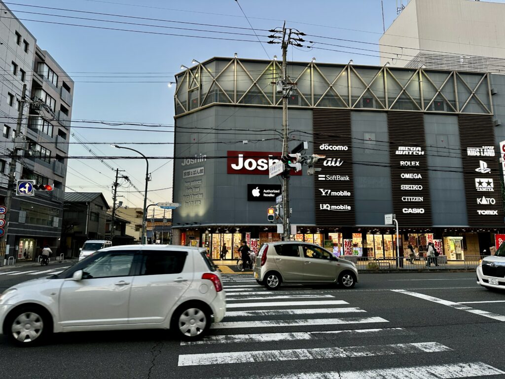 「西院春日神社」を出たら、右に曲がり、「Joshin」前の交差点を渡り、左方向に行き、四条通りをまっすぐいくと右手にが阪急「西院」駅が見えます