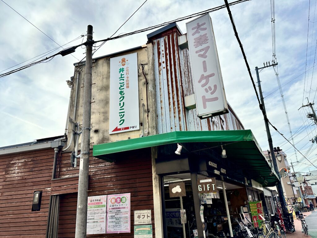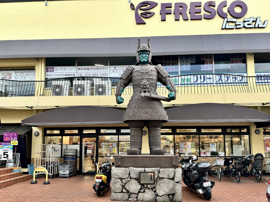 大映通り商店街沿いに、ひときわ目立つ大きな像がスーパーマーケットの前に現れます。