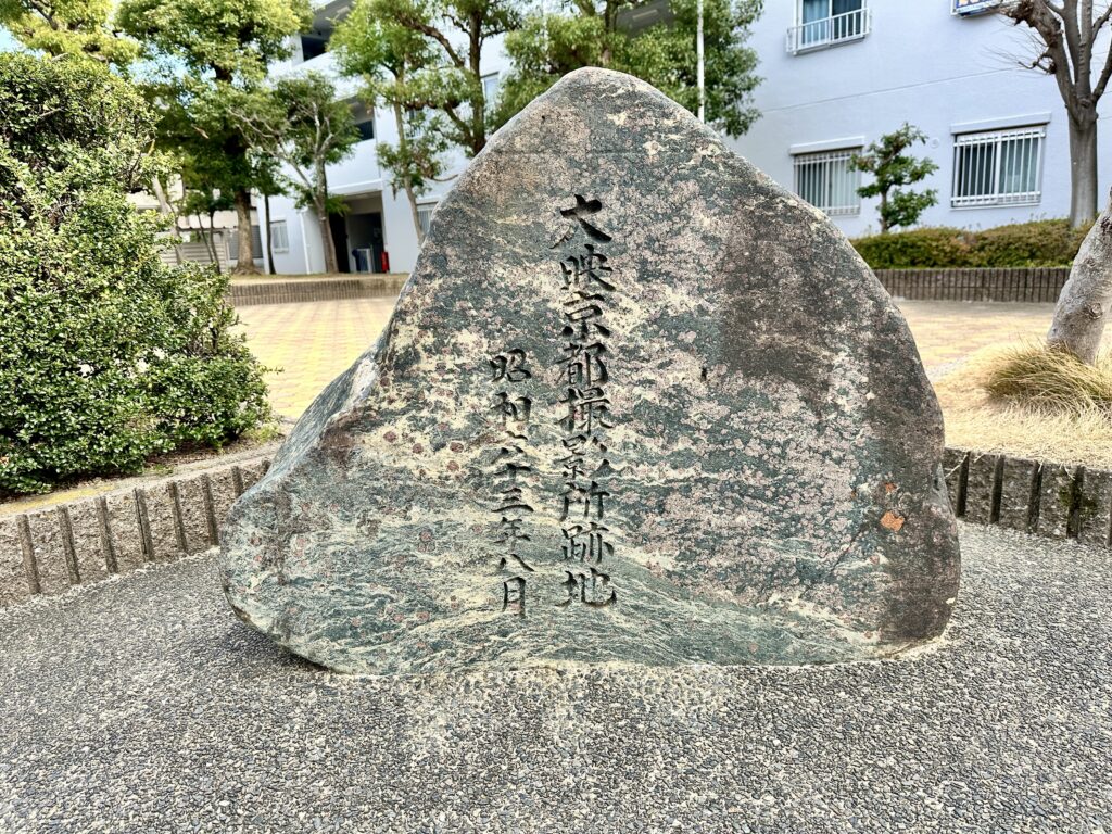 ※昭和3(1928)年,この地に日活太秦撮影所が設立され,同17年大映がこれを引き継いだが,同社は昭和46年に倒産し,撮影所も閉鎖された。この石標は大映京都撮影所跡を示すものである。引用:京都市2002年2月20日調査