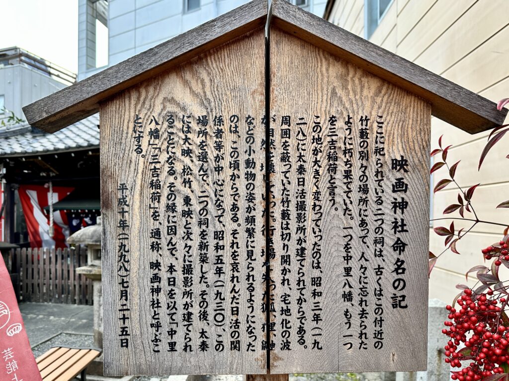 境内には「映画の父」と呼ばれる牧野省三の碑が立てられ、奉納者には日本を代表する映画スターの名前が並んでいます。