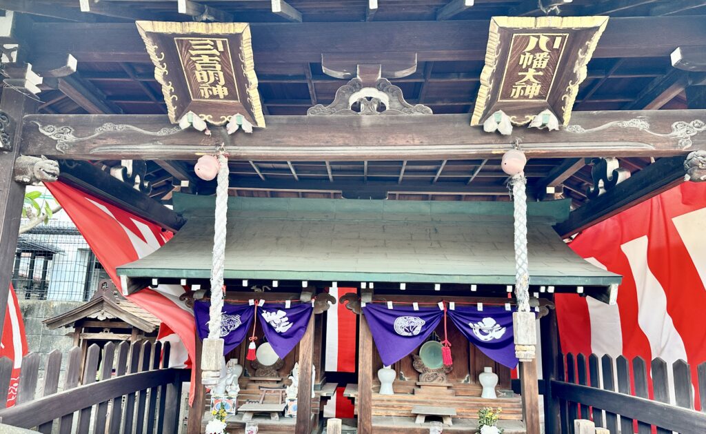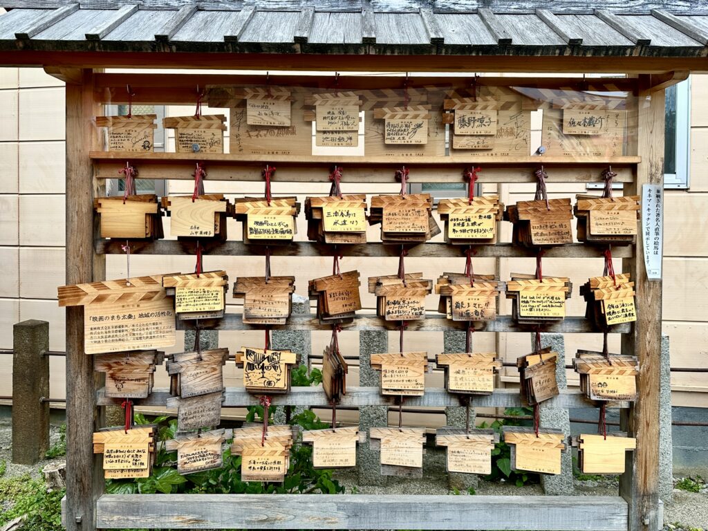 三吉稲荷は映画関係者からの信仰が厚い神社です。奉納された絵馬は、カチンコを模したもので、中には著名人や映画関係者と思われる人のものも。