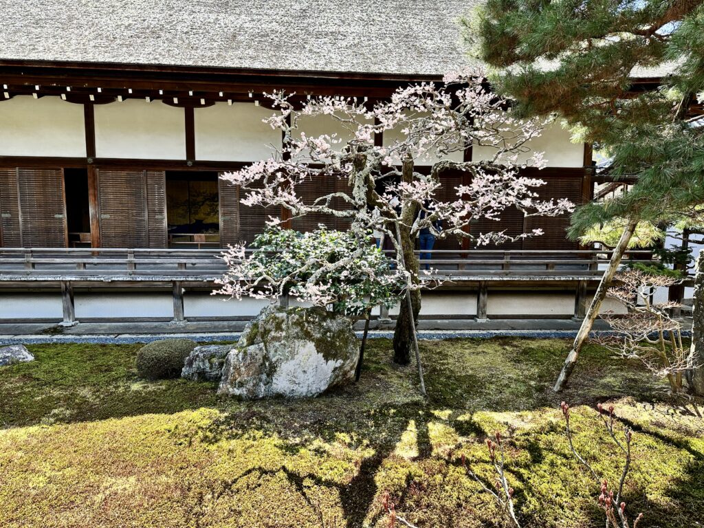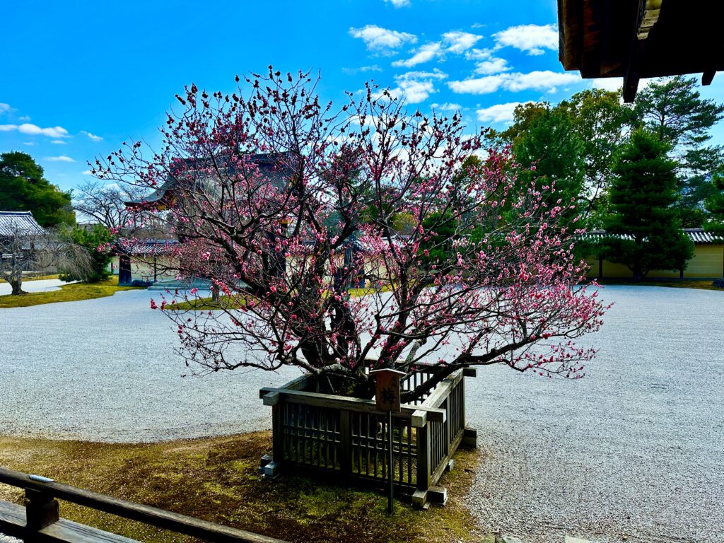 大覚寺の宸殿前には、平安時代の古式を伝える「左近の梅」と「右近の橘」が植えられています。現代の御所では左近は桜ですが、大覚寺では旧嵯峨御所の格式に基づき梅が植え続けられており、毎年2月中旬頃からほころび始め、3月上旬〜中旬に見頃を迎えます。