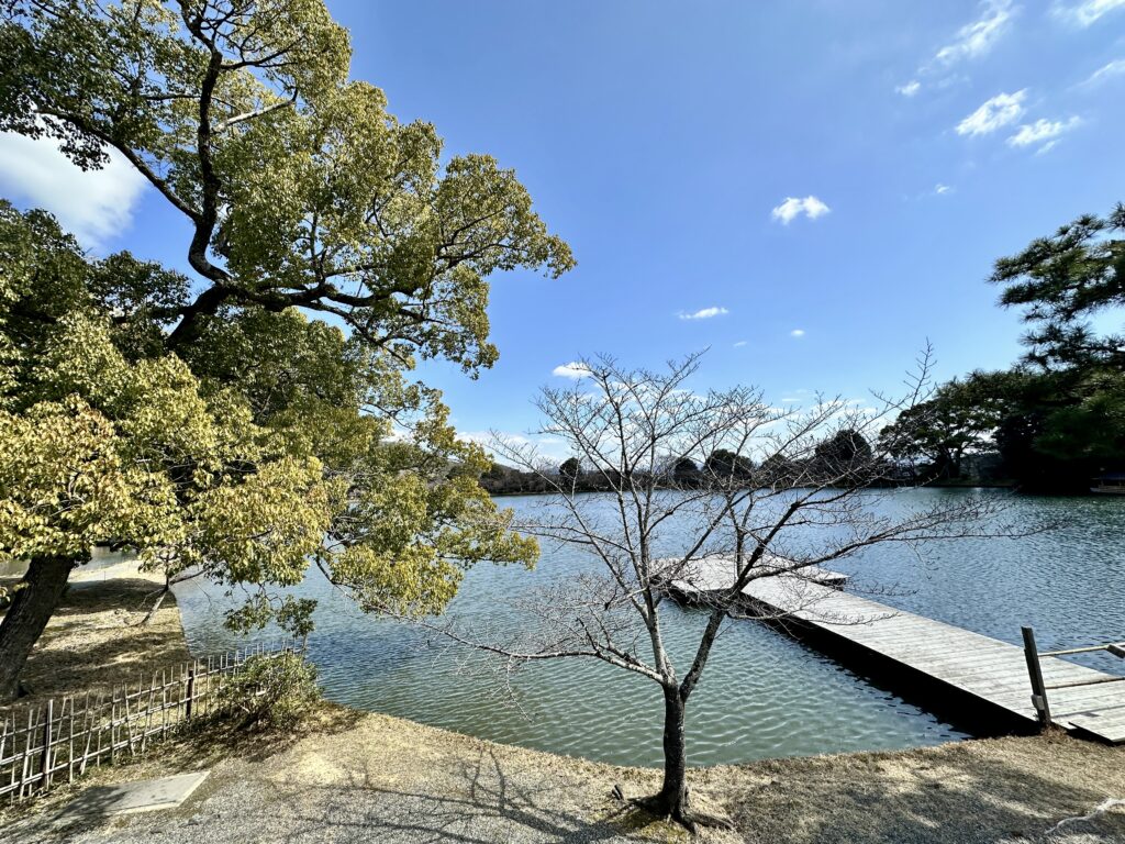 梅林の背景には、心経宝塔、大沢池の景色があり、平安時代の離宮の風景を感じる静かな梅景色が魅力です。