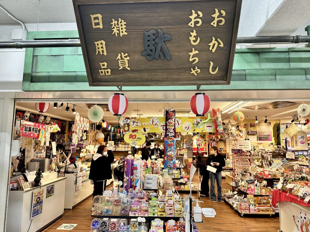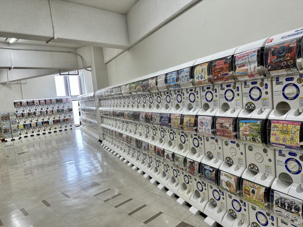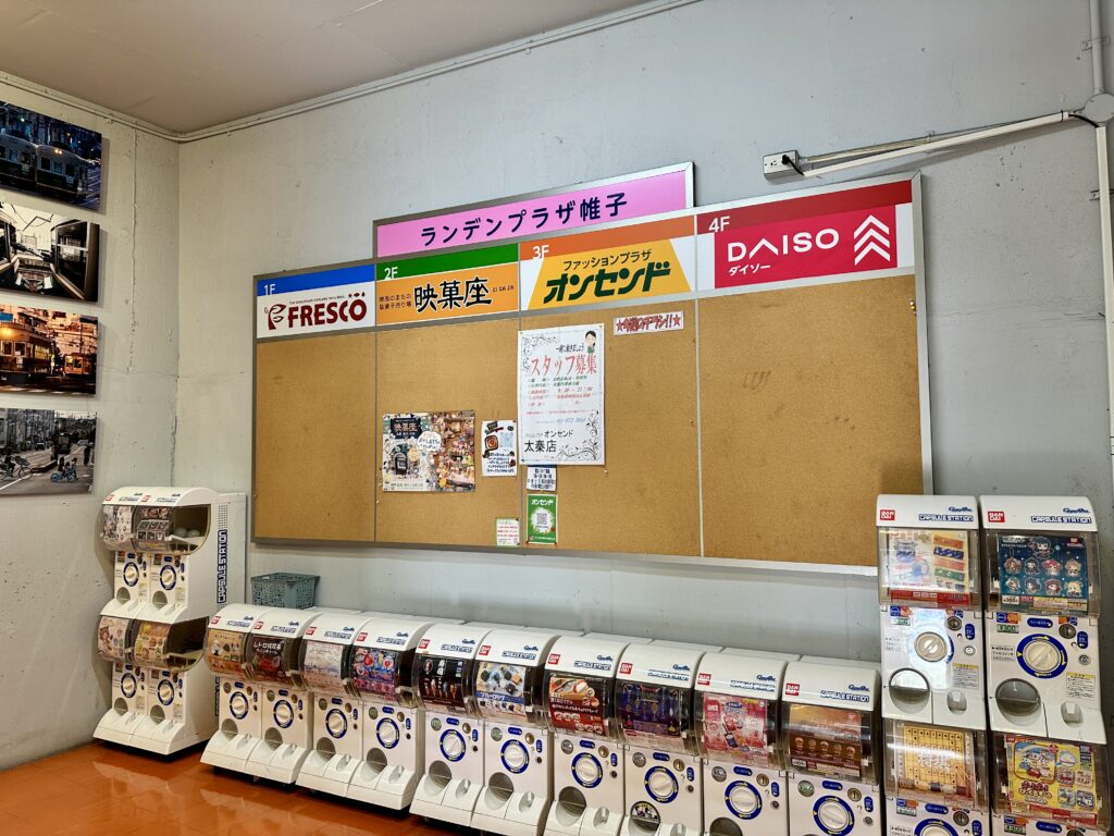 2階には、圧巻のガチャ!ガチャ好きには、いくらお金があっても足らないかも!1階には、スーパーフレスコ、2階には、駄菓子屋の映菓座、3階には、日用品のオンセンド、4階には、ダイソーが入っています。