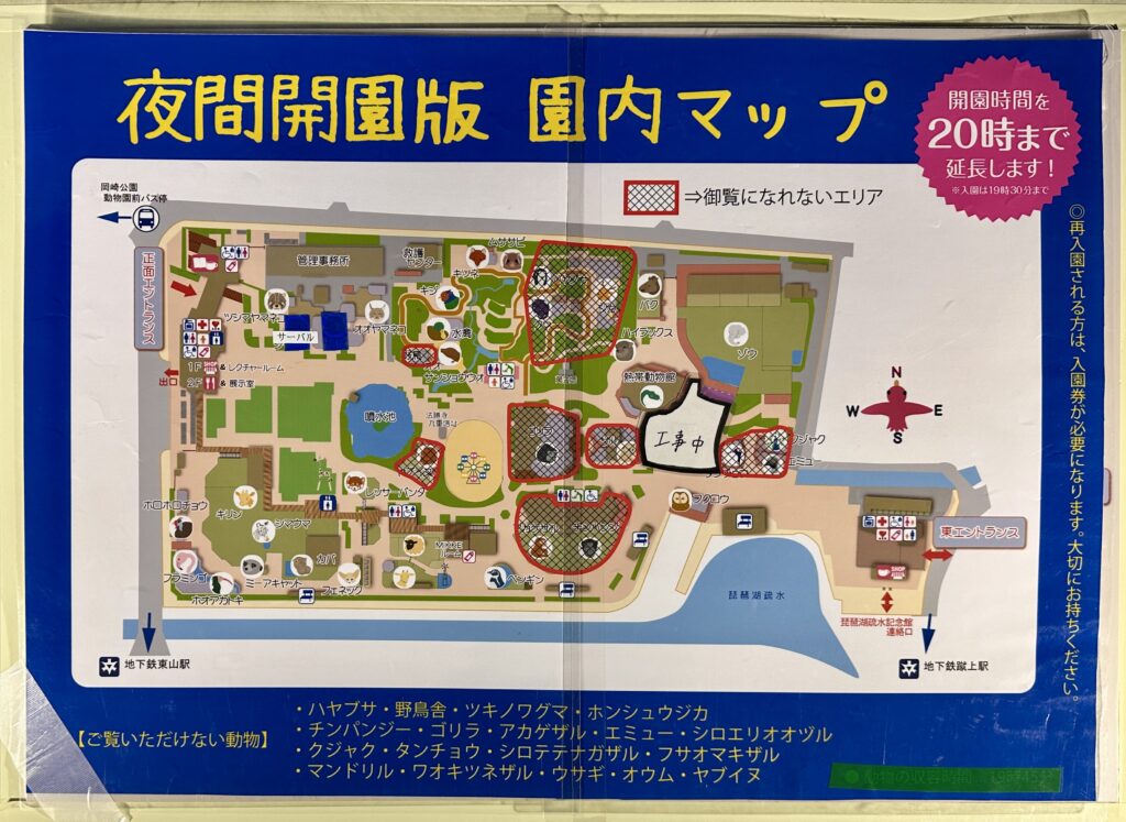 昼間と違って会えない仲間たちも多いけど、会えるお友達も多いから遊びに来てね。「夜間開園版園内マップ」で会えるお友達をチェック