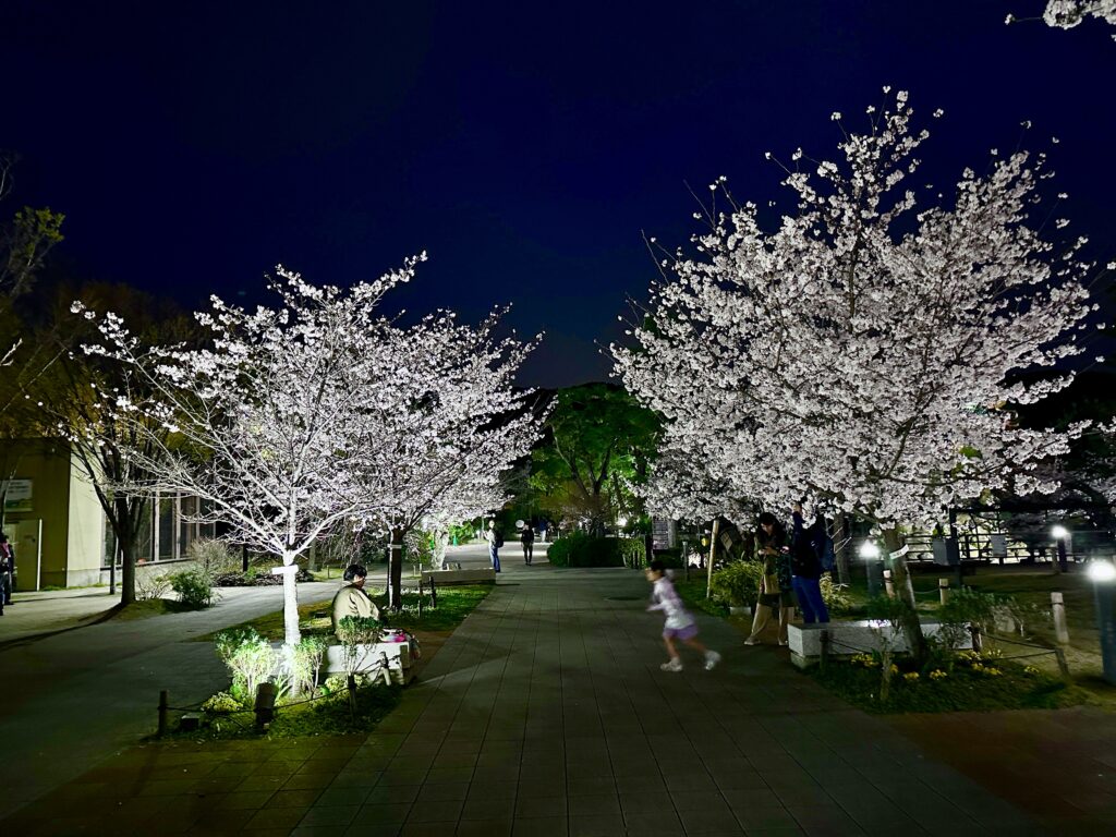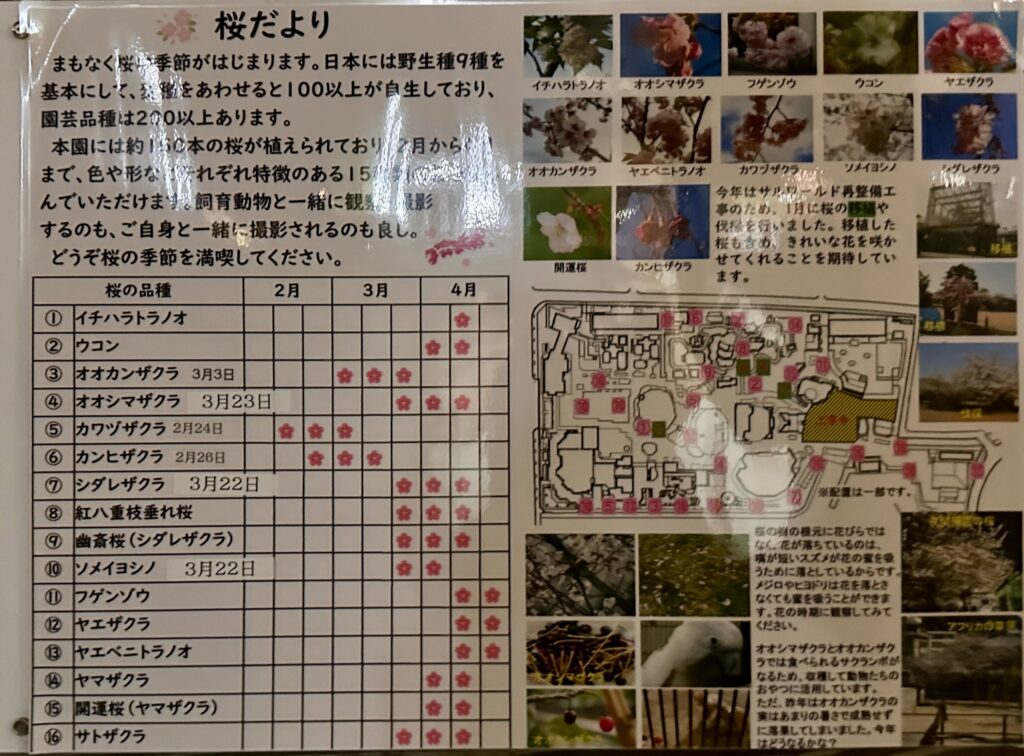園内を散策している間にすっかり夜桜に。動物たちより、お花見になりそうね!桜の見頃マップもあるから参考にしてみてね