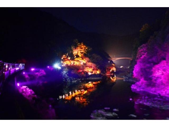- トロッコ嵯峨野駅到着、トロッコ列車『嵯峨野(さがの)ロマンティックトレイン』 乗車 (60分)・・・イルミネーションで装飾された線路を走る「光の幻想列車」に乗車。神秘的な色どりを見せる山々、鮮やかな光で煌めく川の流れなど幻想的な景色をお楽しみください。