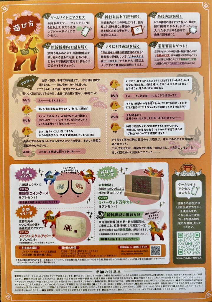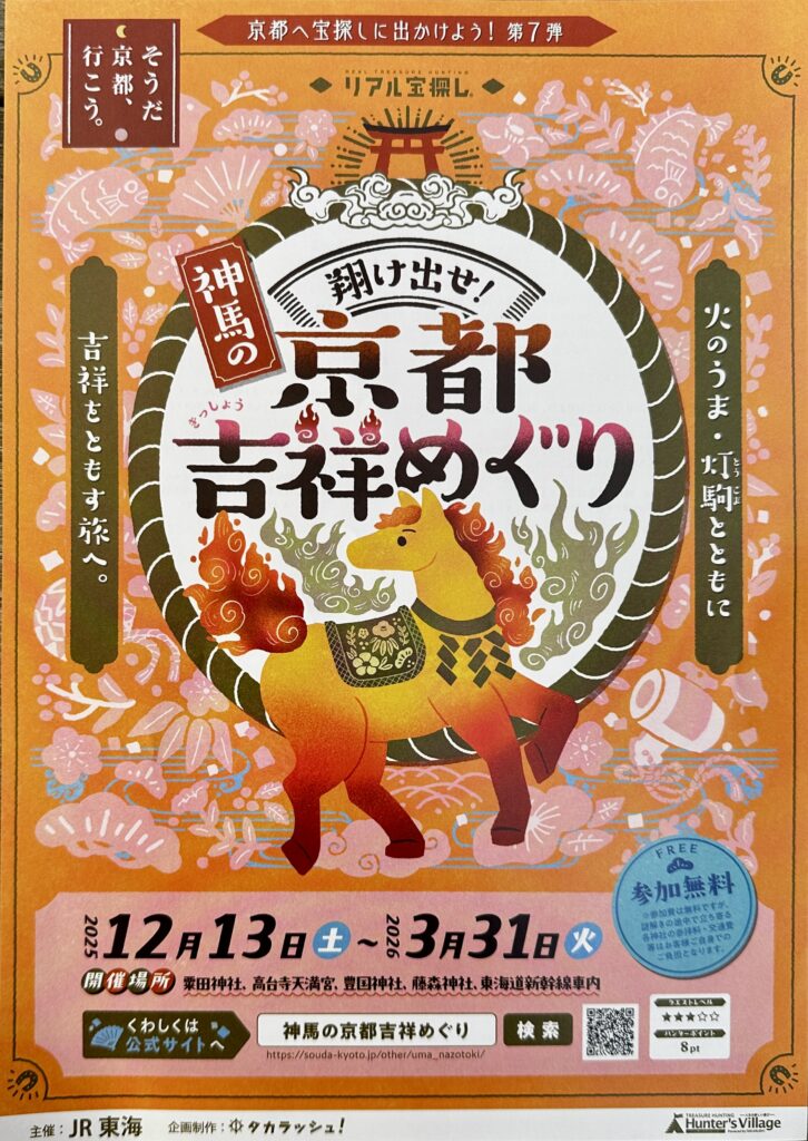 京都の神社仏閣 御利益めぐり 期間限定イベント 未分類 新馬の京都吉祥めぐり 本ページはプロモーションが含まれています。 【リアル宝探し】2026京都吉祥(きっしょう)めぐり 開催期間2025年12月13日 (土)~ 2026年03月31日(火) 参加費用無料(※参加費は無料ですが、謎解きの途中で立ち寄る各神社の参拝料、交通費等は別途) 開催エリア・開催場所粟田神社、高台寺天満宮、豊国神社、藤森神社、東海道新幹線車内 遊び方は 京都へ宝探しに出かけよう!第7弾 翔け出せ!神馬の京都吉祥めぐり 粟田神社(あわたじんじゃ) 豊国神社(とよくにじんじゃ) 藤森神社(ふじのもりじんじゃ) 予約できます!2026年1月の京都おすすめツアー バスで回る!京都【都七福神ツアー】2026/1/1~31 京の新酒とクラフトビールを楽しむほろよいコース(1月~3月) 特別公開 仁和寺 観音堂+東寺 五重塔+光清寺 バスツアー(2026/1/9~2/23) 特別公開 高台寺+大光院+方広寺+豊国神社(1/9~3/17)バスツアー